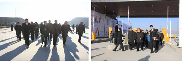在保稅物流中心卡口上方"青海曹家堡保稅物流中心"以中英文兩種字體呈現(xiàn),海關標識赫然醒目。王黎明副省長一行在實地查看了1#、2#保稅倉庫、卡口、查驗庫、辦事大廳等設施,并邊走邊聽取物產集團總經理王玉輝關于工程施工進展情況的匯報。